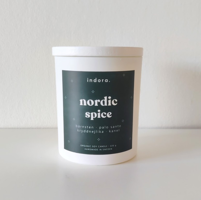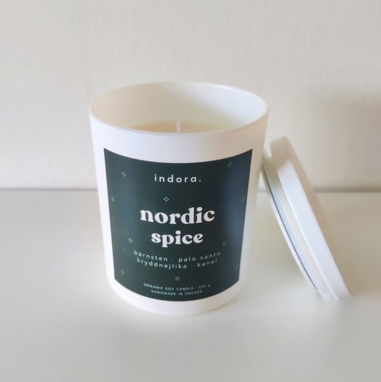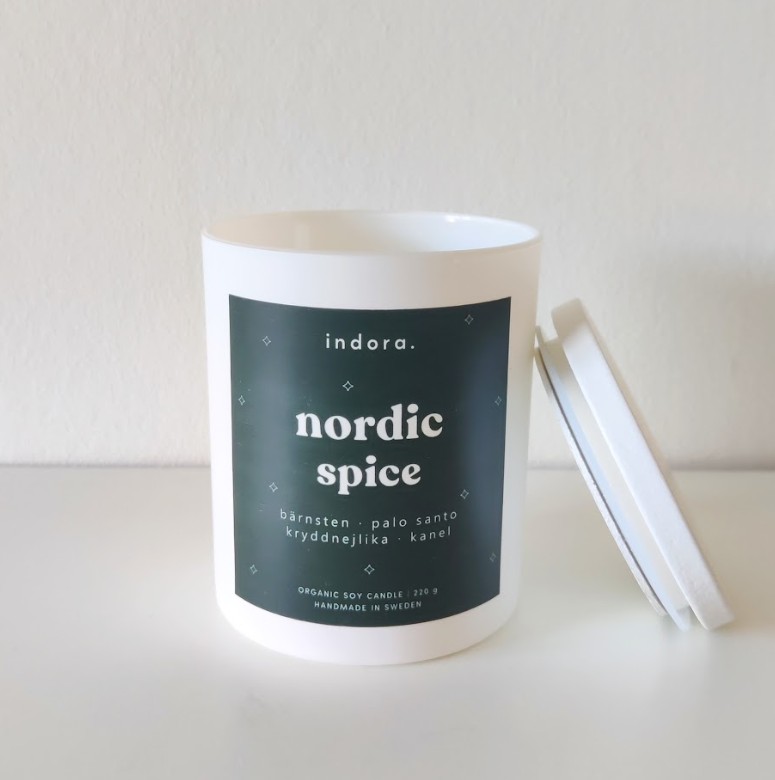 Alla Indoras ljus är tillverkade av veganskt vax och med blyfria vekar för en miljövänlig låga. Ljusen görs förhand i Stockholm och hälls i glasbehållare som går att återanvända.